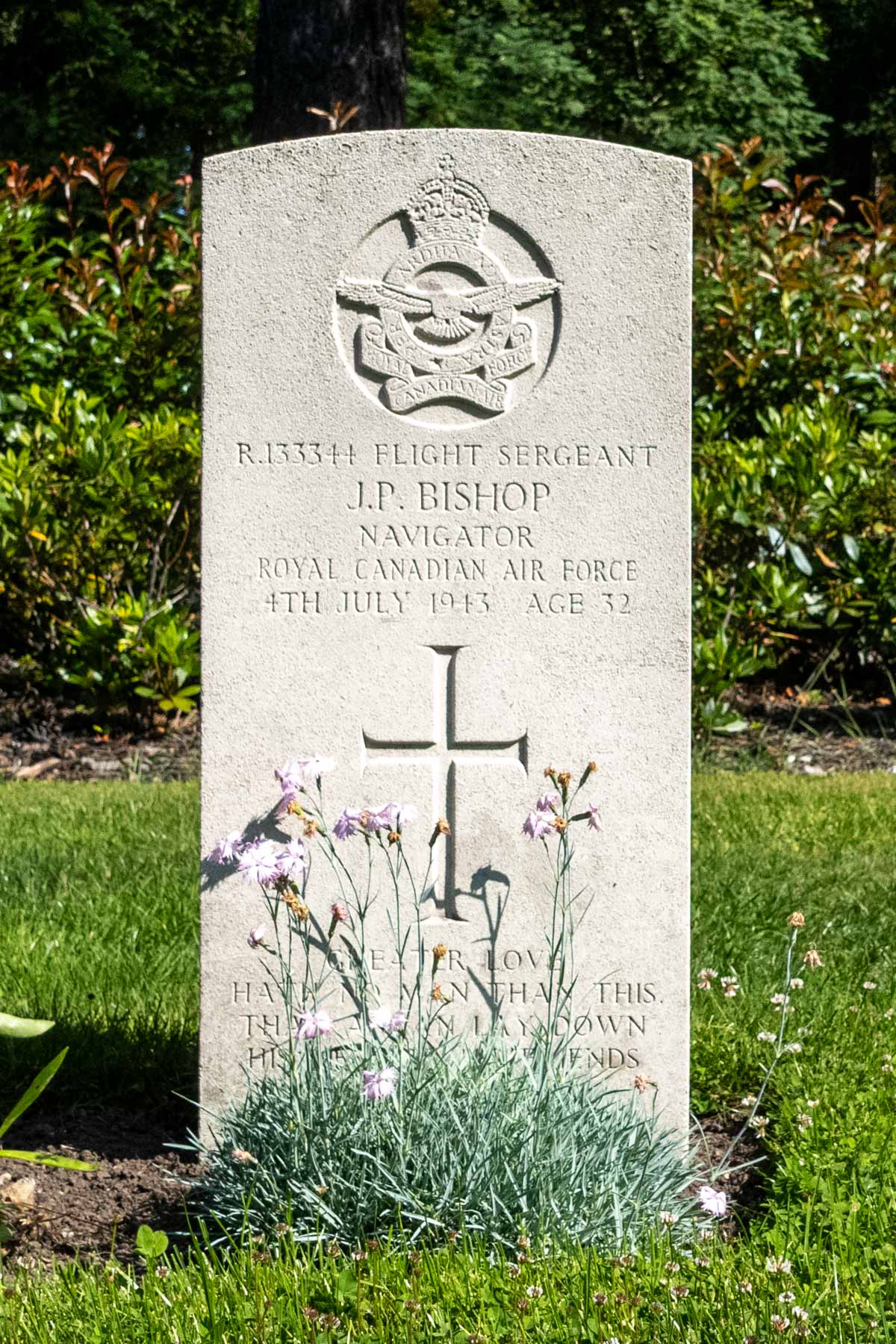Parents: John Augustus Bishop and Mabel Jessica MasonDate of death (dd-mm-yyyy): 04-07-1943Age at death: 32 yearReason of death: Shot down and crashed near Averbode, Belgium.Presumed place of death: Averbode, BelgiumTemporary cemetery: Temporary cemetery General cemetery Averbode, MR 075743, SH03 1/250,000 GSGS 4336.Final cemetery: Canadian War CemeteryGrave number (plot, row, grave): 11 H 12Rank: Flight SergeantService number: R/133344Country served: Canada