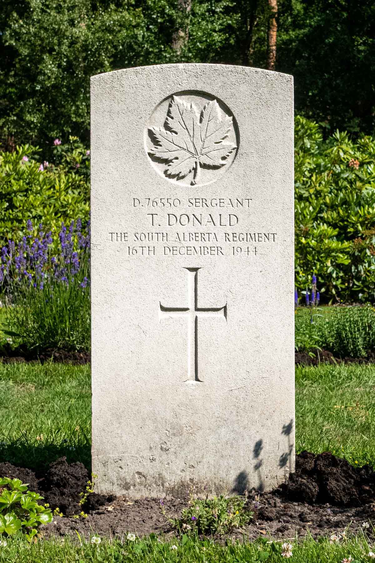 Spouse: Emma ElizabethParents: James Donald and Mary Gillon.Date of death (dd-mm-yyyy): 16-12-1944Age at death: 37 yearReason of death: Jeep hits an anti-vehicle mine.Presumed place of death: Between Dongen and Capelle, along the south of the MaasTemporary cemetery: Nieuwvaart, CapelleFinal cemetery: Canadian War CemeteryGrave number (plot, row, grave): 08 G 02Rank: SergeantService number: D/76550