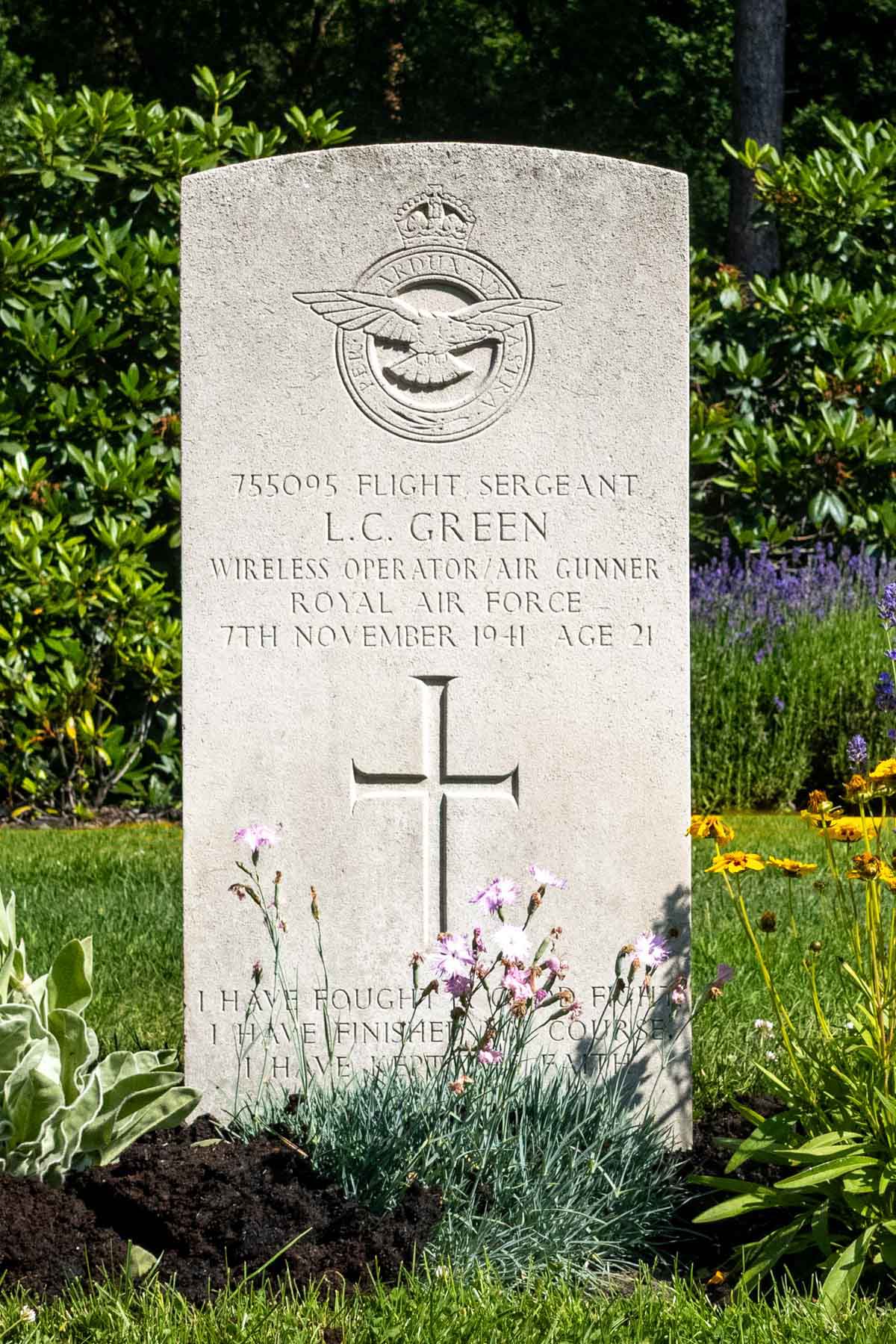 Parents: William and Rose GreenDate of death (dd-mm-yyyy): 07-11-1941Age at death: 21 yearReason of death: Plane crashPresumed place of death: Soaremoarre, Friesland, NetherlandsTemporary cemetery: Crash locationFinal cemetery: Canadian War CemeteryGrave number (plot, row, grave): 08 H 05Rank: Flight SergeantService number: 755095Country served: United Kingdom