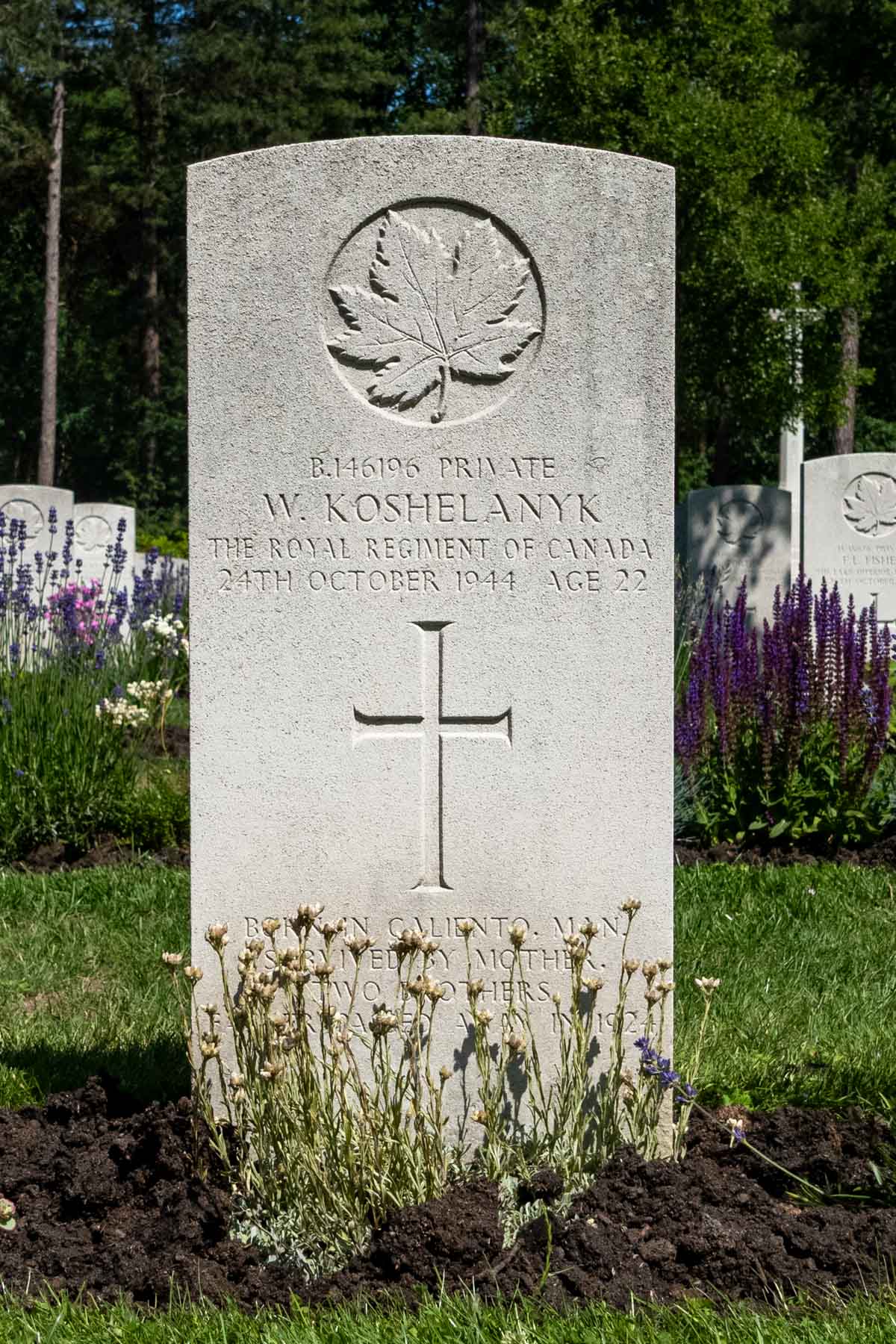 Parents: Joseph and Helen KoshelanykDate of death (dd-mm-yyyy): 24-10-1944Age at death: 22 yearReason of death: Killed in battlePresumed place of death: Near Ossendrecht, province of North BrabantTemporary cemetery: Ossendrecht Cemetery, 23NE, 57841800.Final cemetery: Canadian War CemeteryGrave number (plot, row, grave): 03 C 11Rank: PrivateService number: B/146196