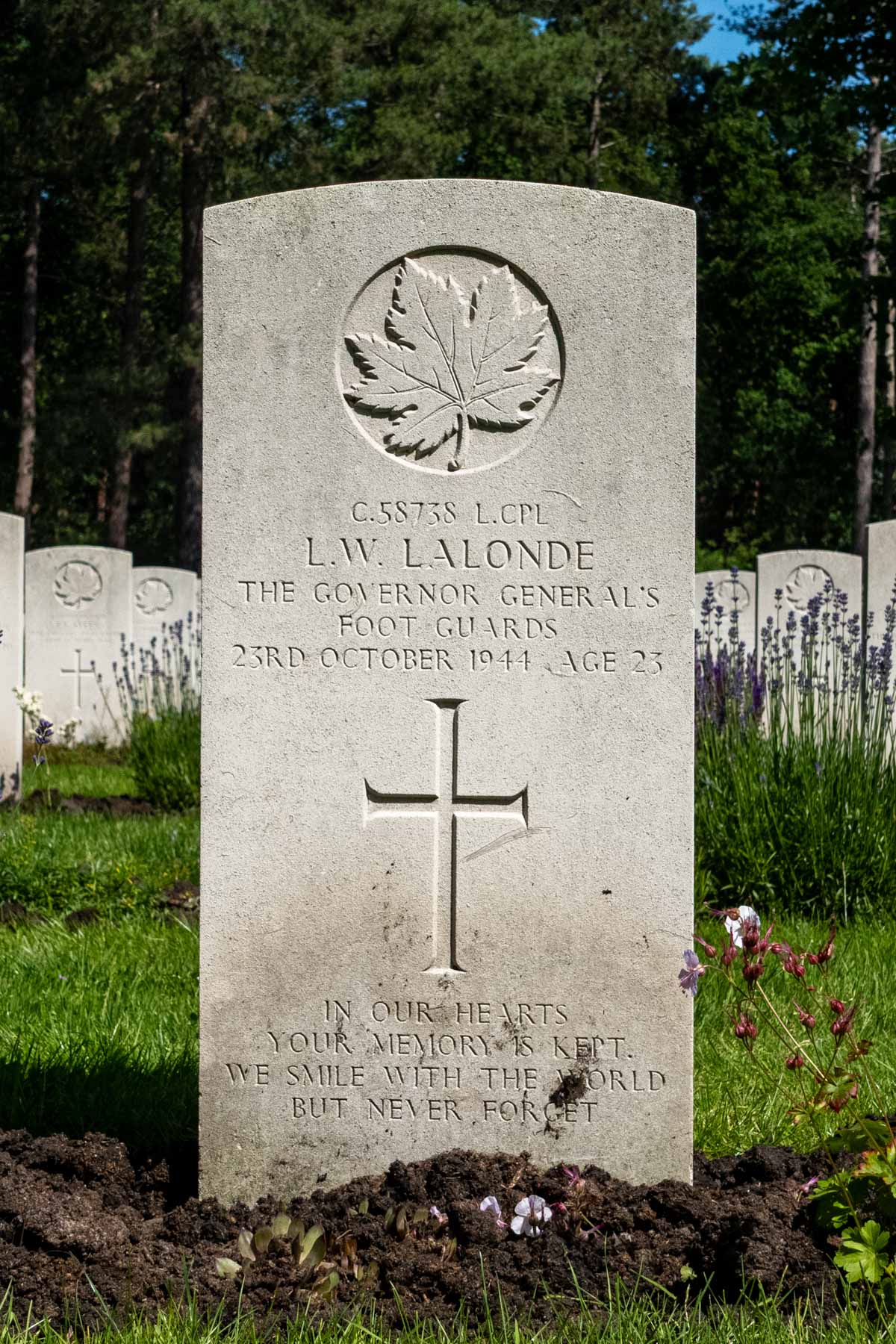 Parents: Archibald and Adele LalondeDate of death (dd-mm-yyyy): 23-10-1944Age at death: 23 yearReason of death: A shell pierces the gun turret of the Sherman tankPresumed place of death: On a farm on the Mariabaan in Wouwse PlantageTemporary cemetery: In Essen, at the Velodreef- Scherpheuvelstraat.Final cemetery: Canadian War CemeteryGrave number (plot, row, grave): 01 C 11Rank: Lance CorporalService number: C/58738Country served: Canada