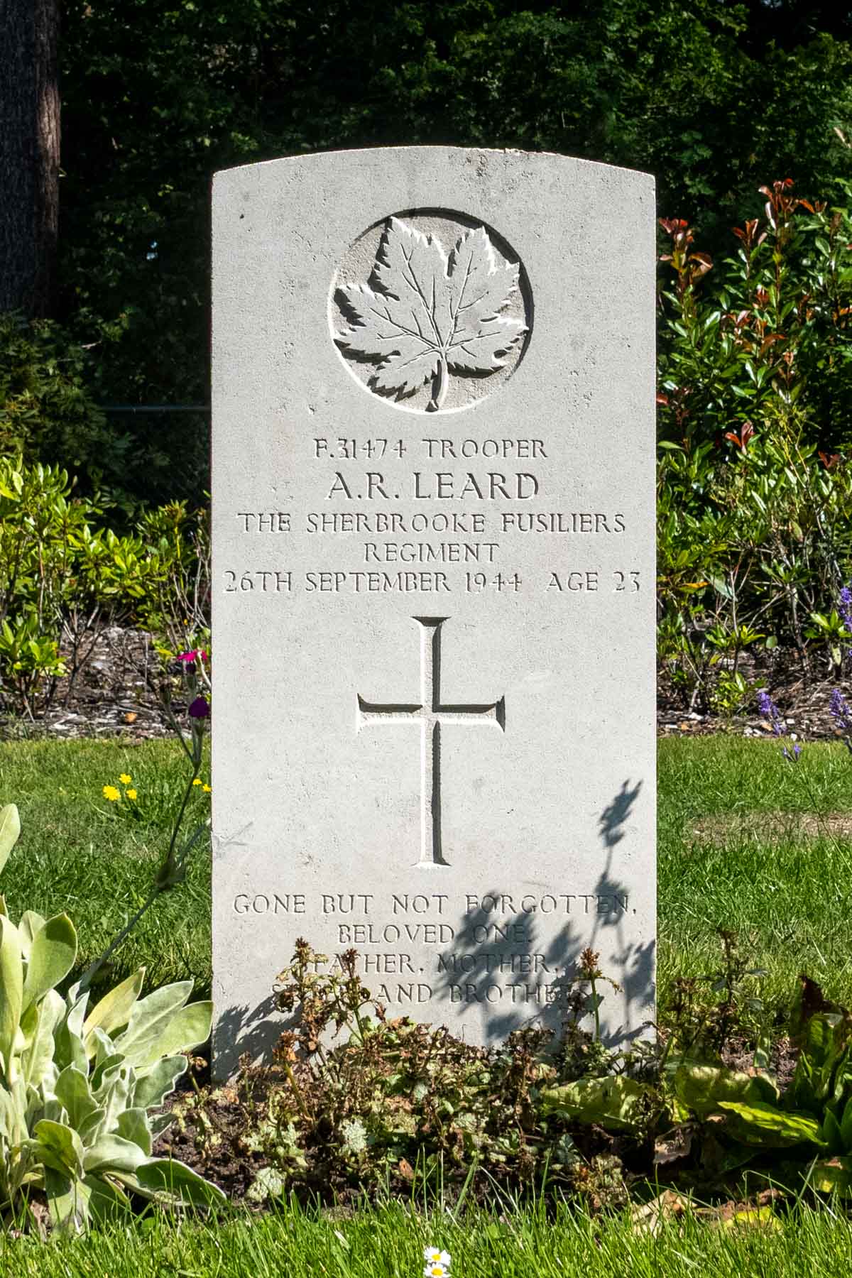 Parents: Lloyd and Margaret LeardDate of death (dd-mm-yyyy): 26-09-1944Age at death: 22 yearReason of death: Killed in actionTemporary cemetery: Wechelderzande, BelgiumFinal cemetery: Canadian War CemeteryGrave number (plot, row, grave): 11 H 09Rank: TrooperService number: F/31474