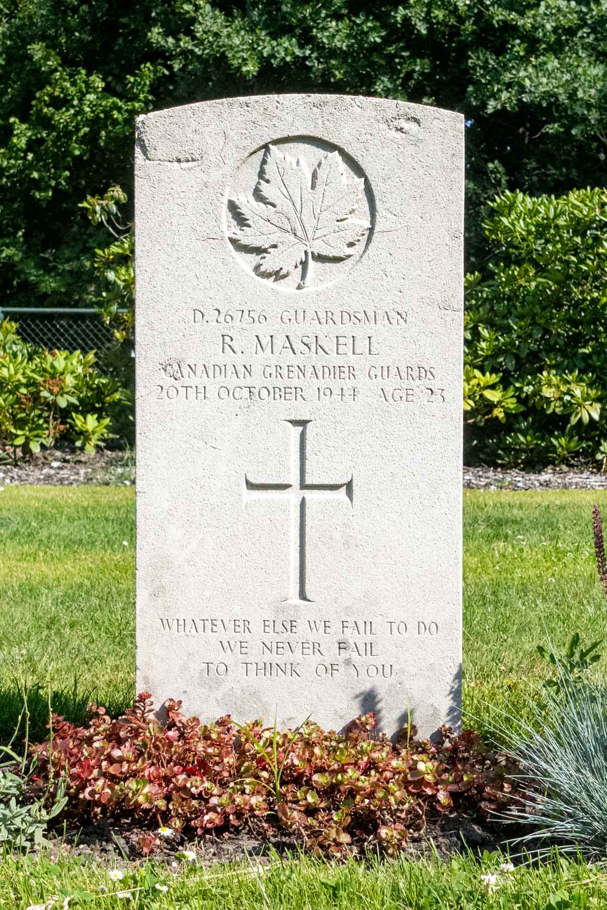 Date of death (dd-mm-yyyy): 20-10-1944Age at death: 23 yearFinal cemetery: Canadian War CemeteryGrave number (plot, row, grave): 10 G 09Rank: GuardsmanService number: D/26756