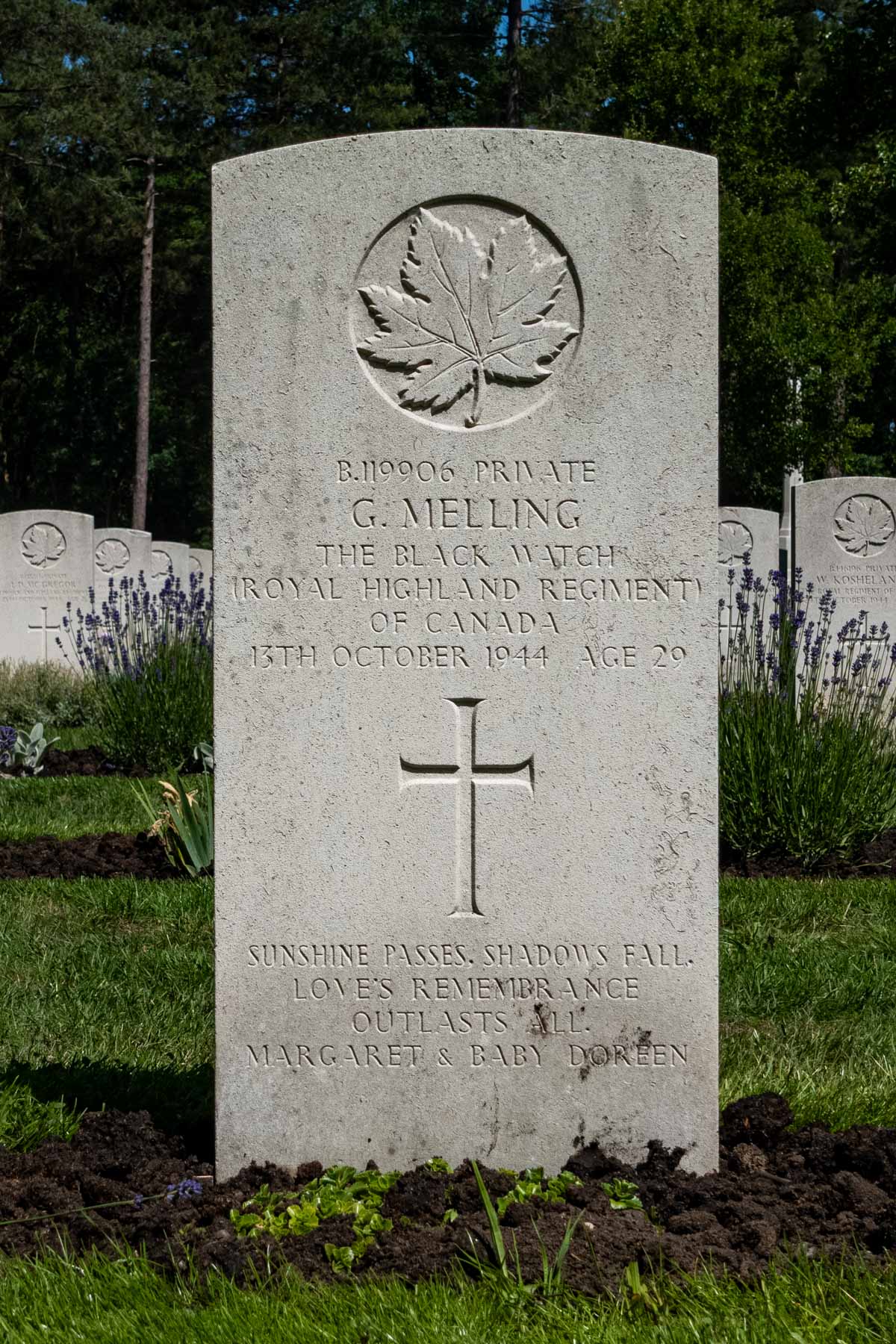 Date of death (dd-mm-yyyy): 13-10-1944Age at death: 29 yearFinal cemetery: Canadian War CemeteryGrave number (plot, row, grave): 03 A 10Rank: PrivateService number: B/119906