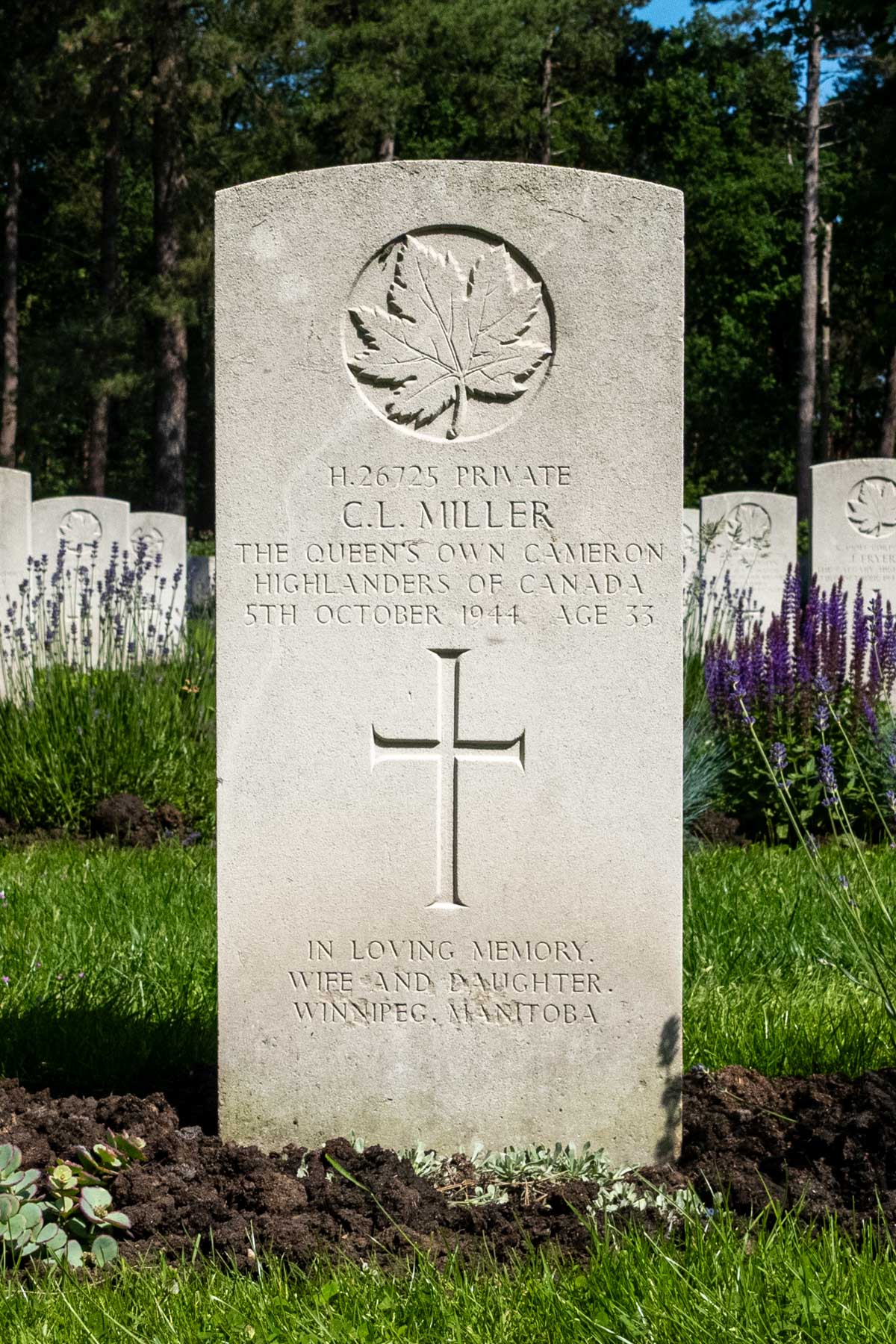 Date of death (dd-mm-yyyy): 05-10-1944Age at death: 33 yearFinal cemetery: Canadian War CemeteryGrave number (plot, row, grave): 01 D 11Rank: PrivateService number: H/26725