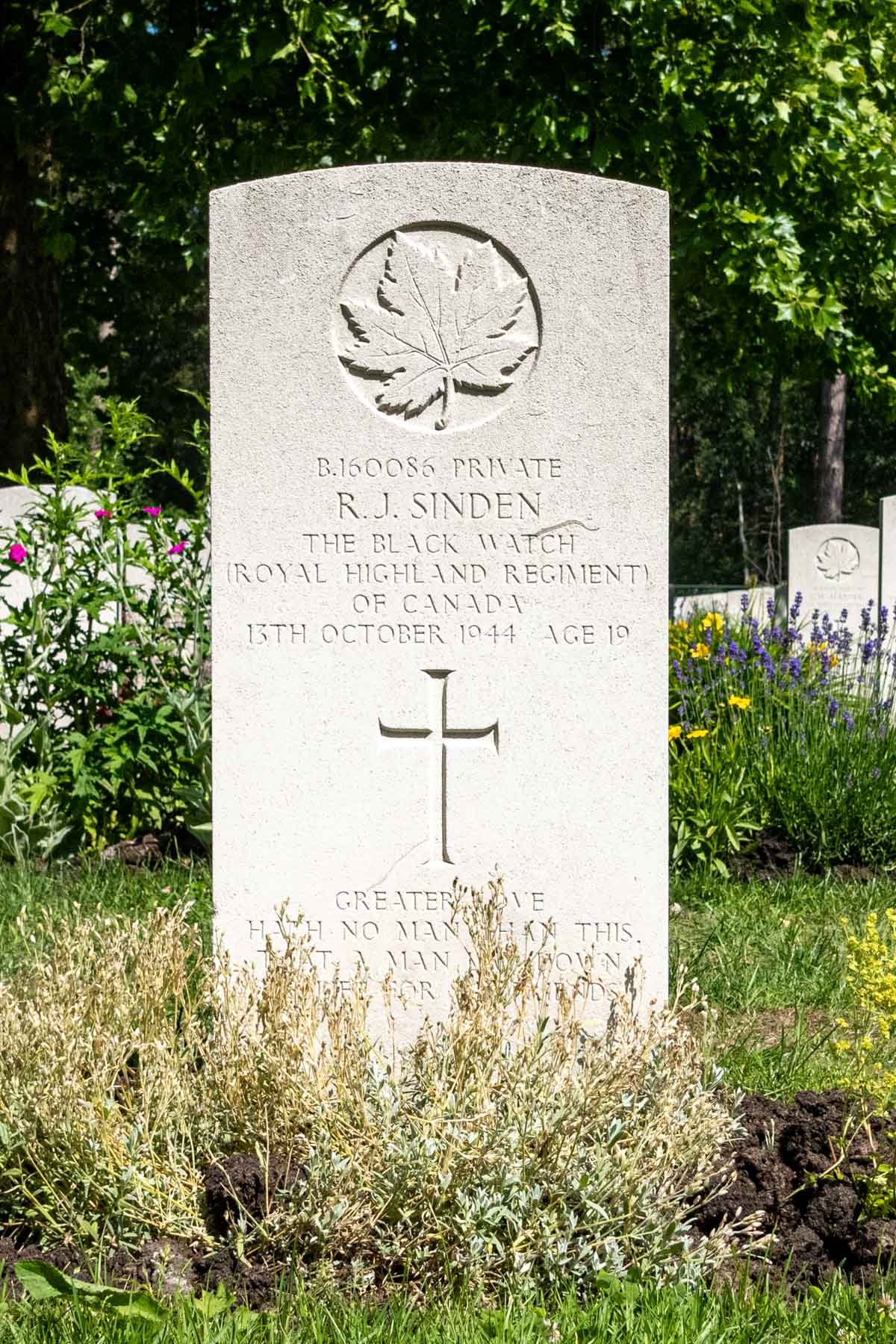 Parents: Arthur Angus and Myrthe Agnes SindenDate of death (dd-mm-yyyy): 13-10-1944Age at death: 19 yearReason of death: Killed in actionPresumed place of death: Caterspolder in WoensdrechtTemporary cemetery: On the current Burgemeester Voetenweg, near the Ossendrecht war memorial.Final cemetery: Canadian War CemeteryGrave number (plot, row, grave): 02 E 09Rank: PrivateService number: B/160086Country served: Canada
