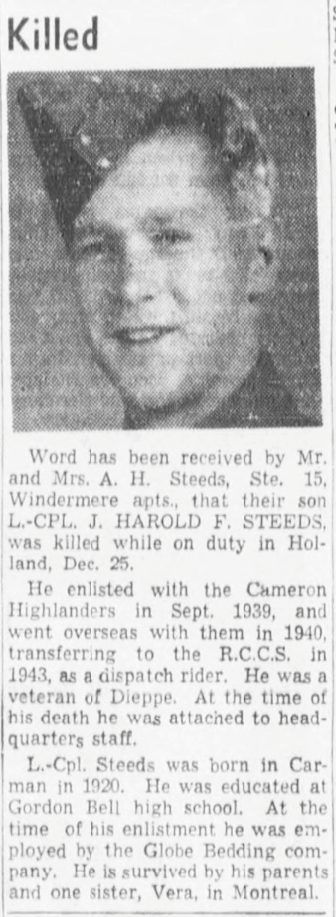 Date of death (dd-mm-yyyy): 25-12-1944Age at death: 24 yearFinal cemetery: Canadian War CemeteryGrave number (plot, row, grave): 10 A 01Rank: Lance CorporalService number: H/19521