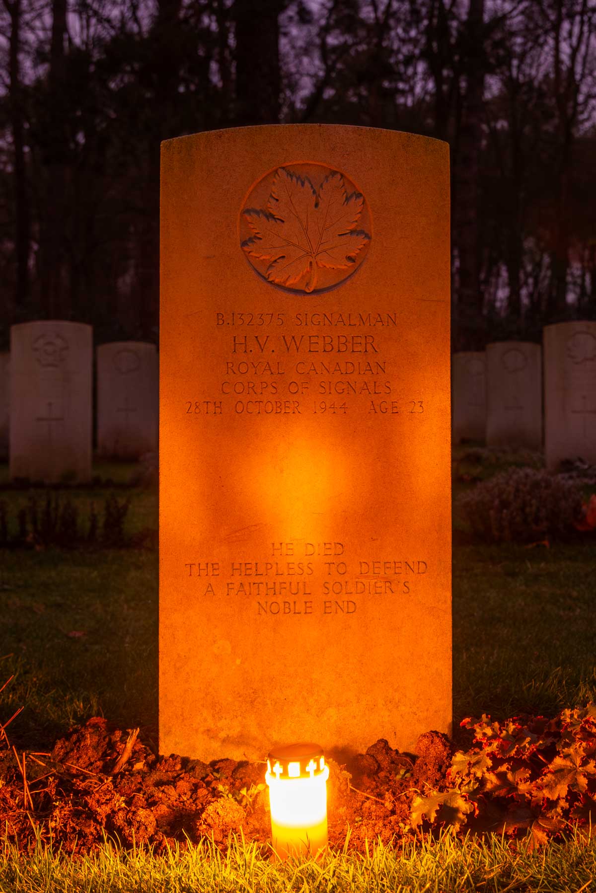Date of death (dd-mm-yyyy): 28-10-1944Age at death: 23 yearFinal cemetery: Canadian War CemeteryGrave number (plot, row, grave): 07 C 08Rank: SignalmanService number: B/132375