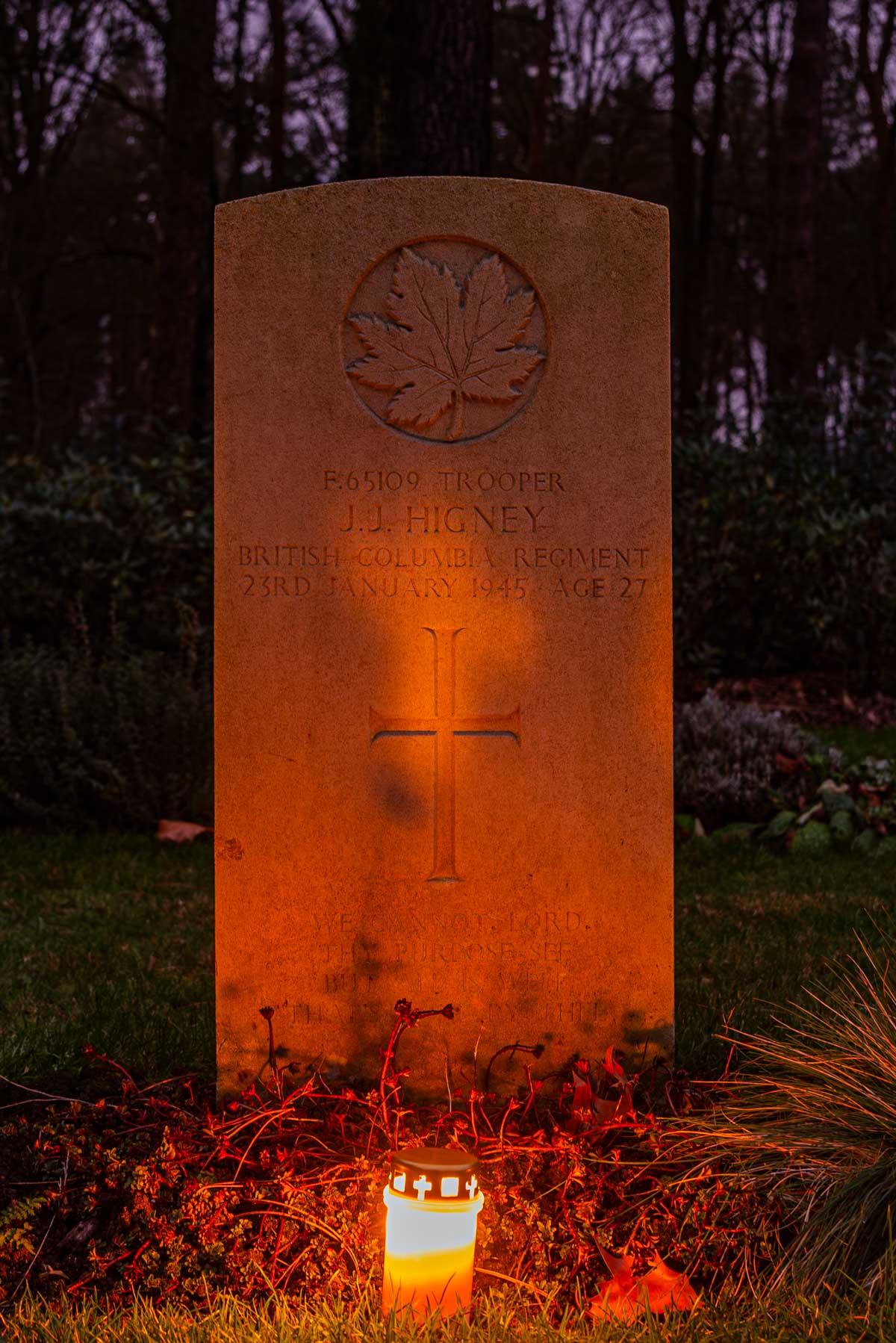 Parents: John James Higney et Kathleen SimpsonDate de décès (jj-mm-aaaa): 23-01-1945Âge au décès: 27 ansRaison du décès: En raison d'un accident de tirLieu présumé du décès: UdenhoutCimetière temporaire: DrunenDernier cimetière: Canadian War CemeteryNuméro de tombe (plot, file, tombe): 07 F 07Rang: TrooperNuméro de service: F/65109