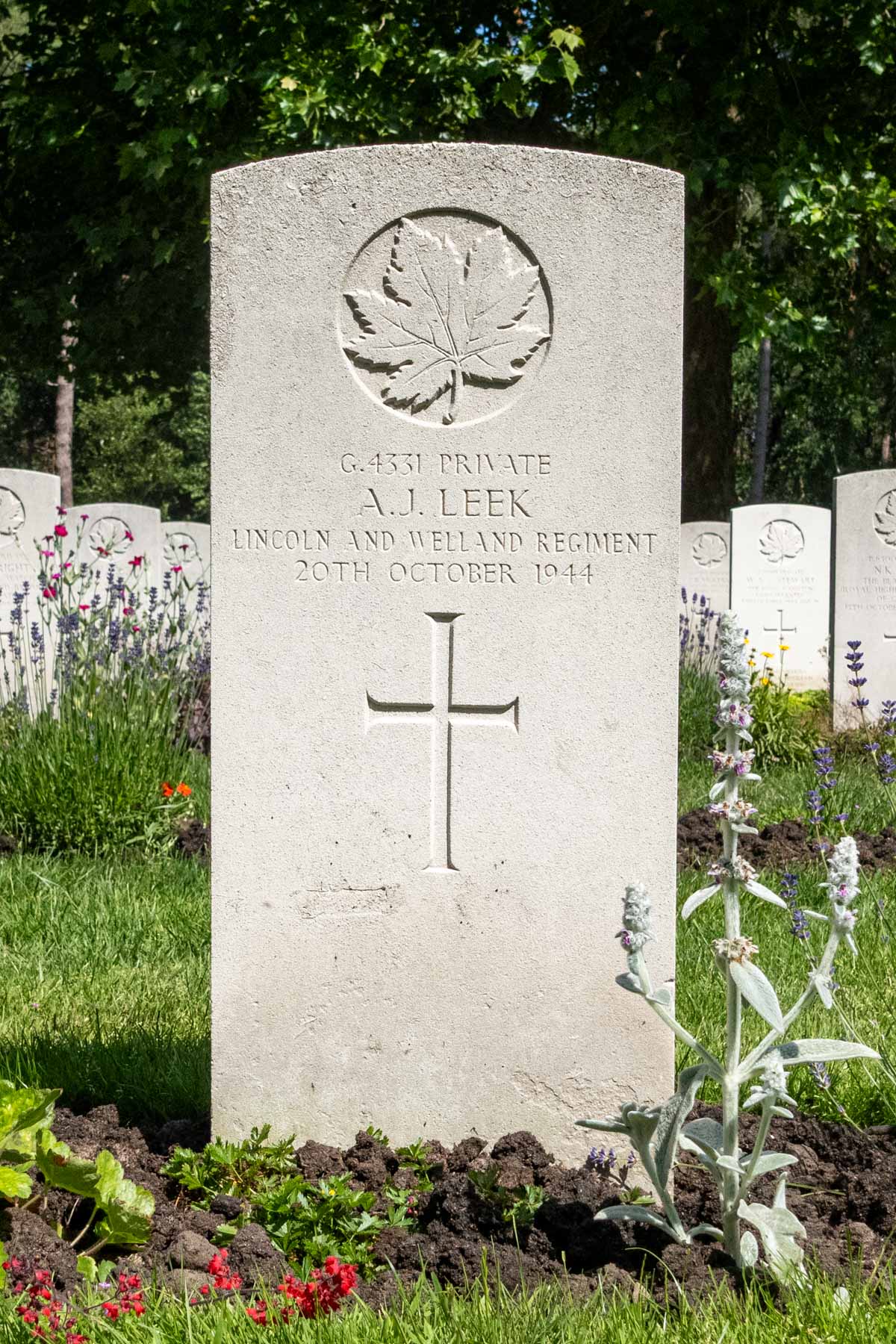 Parents: Earl McCarthy Leek et Mary Gertrude HoweDate de décès (jj-mm-aaaa): 20-10-1944Âge au décès: 19 ansRaison du décès: Tué au combatLieu présumé du décès: près de l'Essensesteenweg à Maria-ter-Heide et de l'aéroport de Brasschaat (B)Cimetière temporaire: Maria-ter-heide, commune de Brasschaat (B) (qD762072)Dernier cimetière: Canadian War CemeteryNuméro de tombe (plot, file, tombe): 02 D 05Rang: PrivateNuméro de service: G/4331