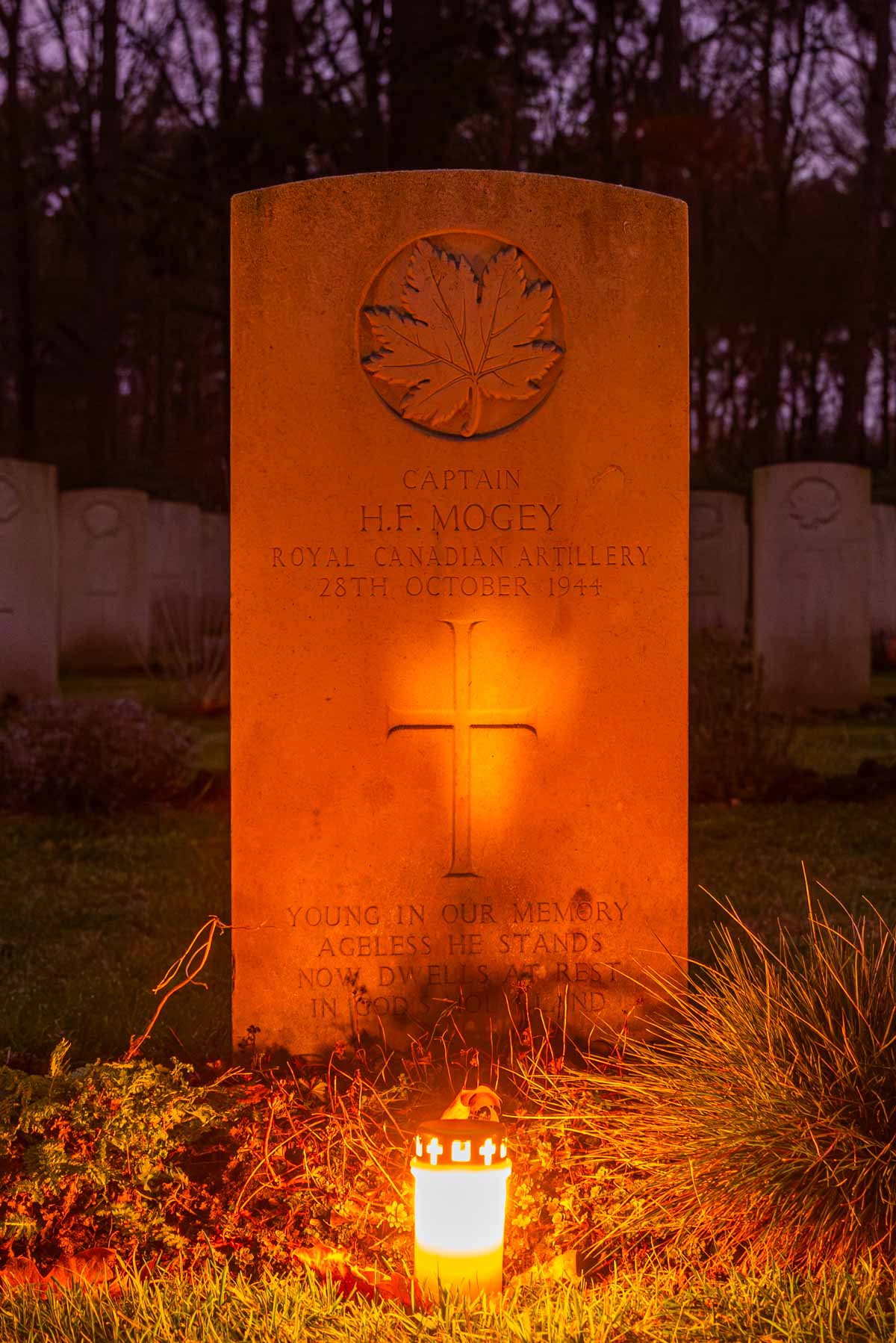 Date de décès (jj-mm-aaaa): 28-10-1944Raison du décès: Touché par un obus de sa propre artillerieLieu présumé du décès: Steenbergsestraat Bergen op ZoomCimetière temporaire: Plein XIII Bergen op ZoomDernier cimetière: Canadian War CemeteryNuméro de tombe (plot, file, tombe): 07 A 07Rang: Captain