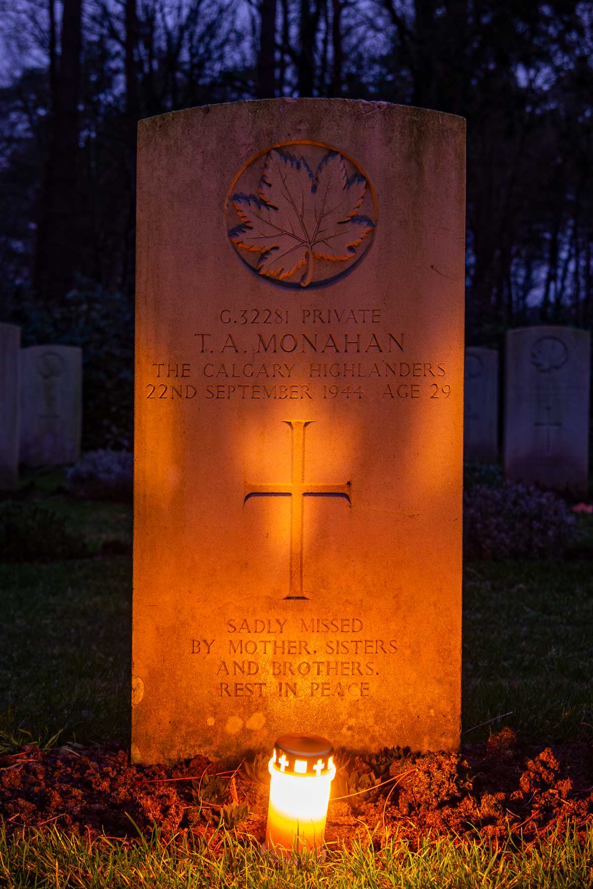 Date de décès (jj-mm-aaaa): 22-09-1944Âge au décès: 29 ansDernier cimetière: Canadian War CemeteryNuméro de tombe (plot, file, tombe): 07 D 03Rang: PrivateNuméro de service: G/32281