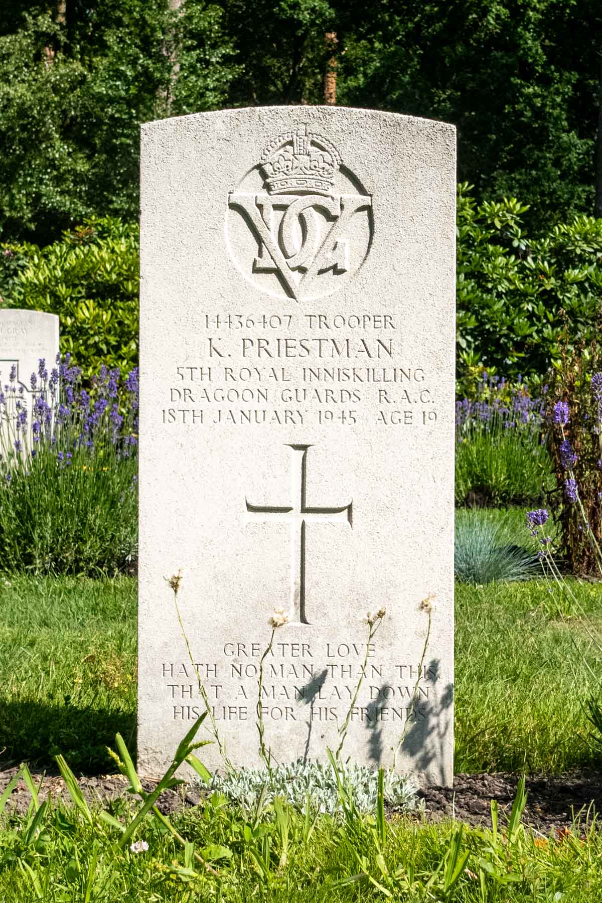 Date de décès (jj-mm-aaaa): 18-01-1945Âge au décès: 19 ansDernier cimetière: Canadian War CemeteryNuméro de tombe (plot, file, tombe): 08 F 03Rang: TrooperNuméro de service: 14436407Pays desservi: Royaume-Uni