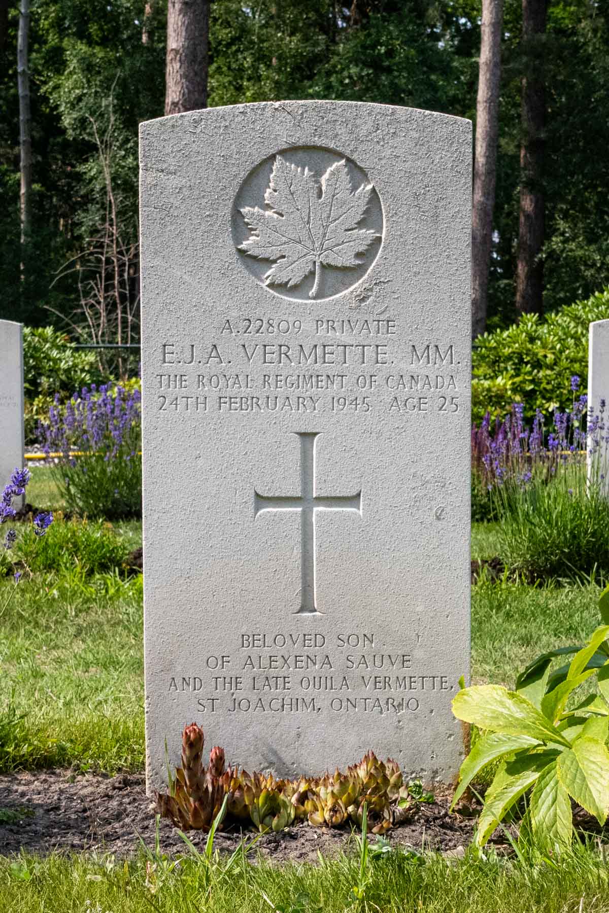 Parents: Quila Vermette et Aelexina SauveDate de décès (jj-mm-aaaa): 24-02-1945Âge au décès: 25 ansRaison du décès: Décédé des suites de blessures reçues au combat.Lieu présumé du décès: Pas connu. Voir aussi histoire de vie.Cimetière temporaire: Cimetière municipal de Turnhout, Belgique, 064059, SH 25&35Dernier cimetière: Canadian War CemeteryNuméro de tombe (plot, file, tombe): 09 E 03Rang: PrivateNuméro de service: A/22809