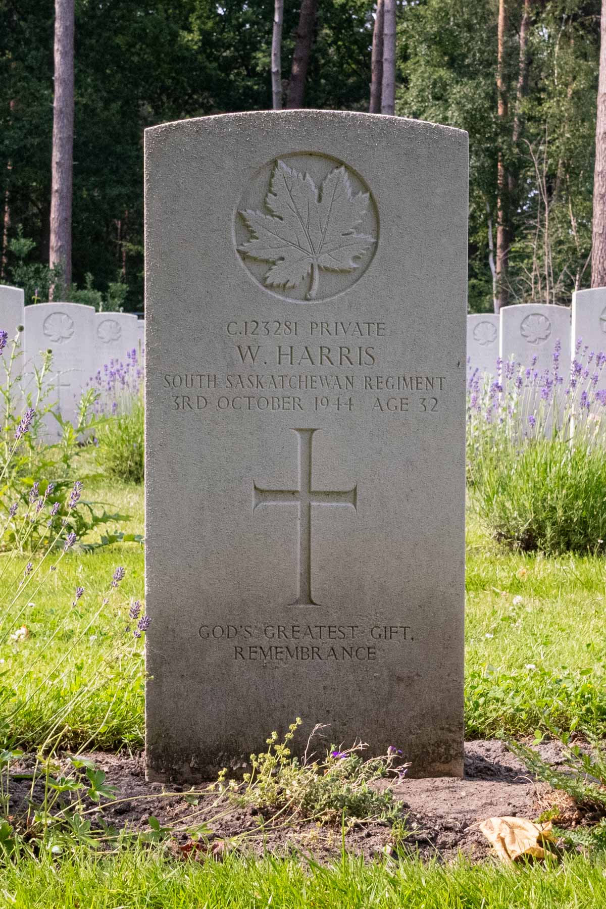 Ouders: James en Barbara HarrisOverlijdensdatum (dd-mm-jjjj): 03-10-1944Leeftijd bij overlijden: 32 jaarReden van overlijden: Gedood tijdens gevechtVermoedelijke sterfplaats: Omgeving Lochtenberg, Belgie. Nu Sint-Job-in-'t-Goor, gemeente Brecht.Tijdelijke begraafplaats: Ter hoogte van (nu) Eikenlei 63, Sint-Job-in-'t-GoorDefinitieve begraafplaats: Canadian War CemeteryGrafnummer (plot, rij, graf): 08 B 10Rang: PrivateServicenummer: C/123281Land waarvoor gediend: Canada