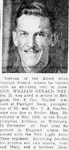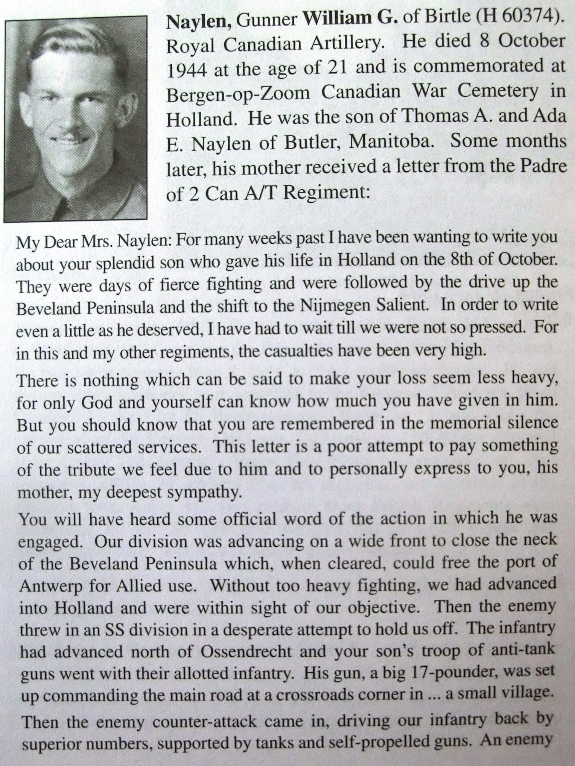 Overlijdensdatum (dd-mm-jjjj): 08-10-1944Leeftijd bij overlijden: 21 jaarDefinitieve begraafplaats: Canadian War CemeteryGrafnummer (plot, rij, graf): 04 B 03Rang: GunnerServicenummer: H/60374
